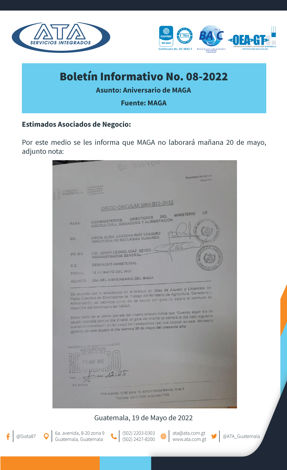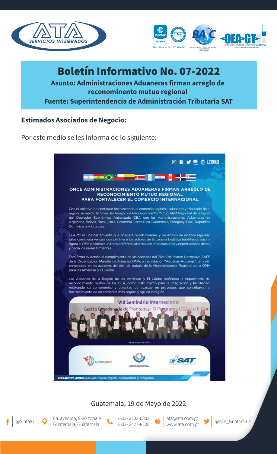 Boletín Informativo No. 07-2022 Administraciones Aduaneras firman arreglo de reconocimiento mutuo regional